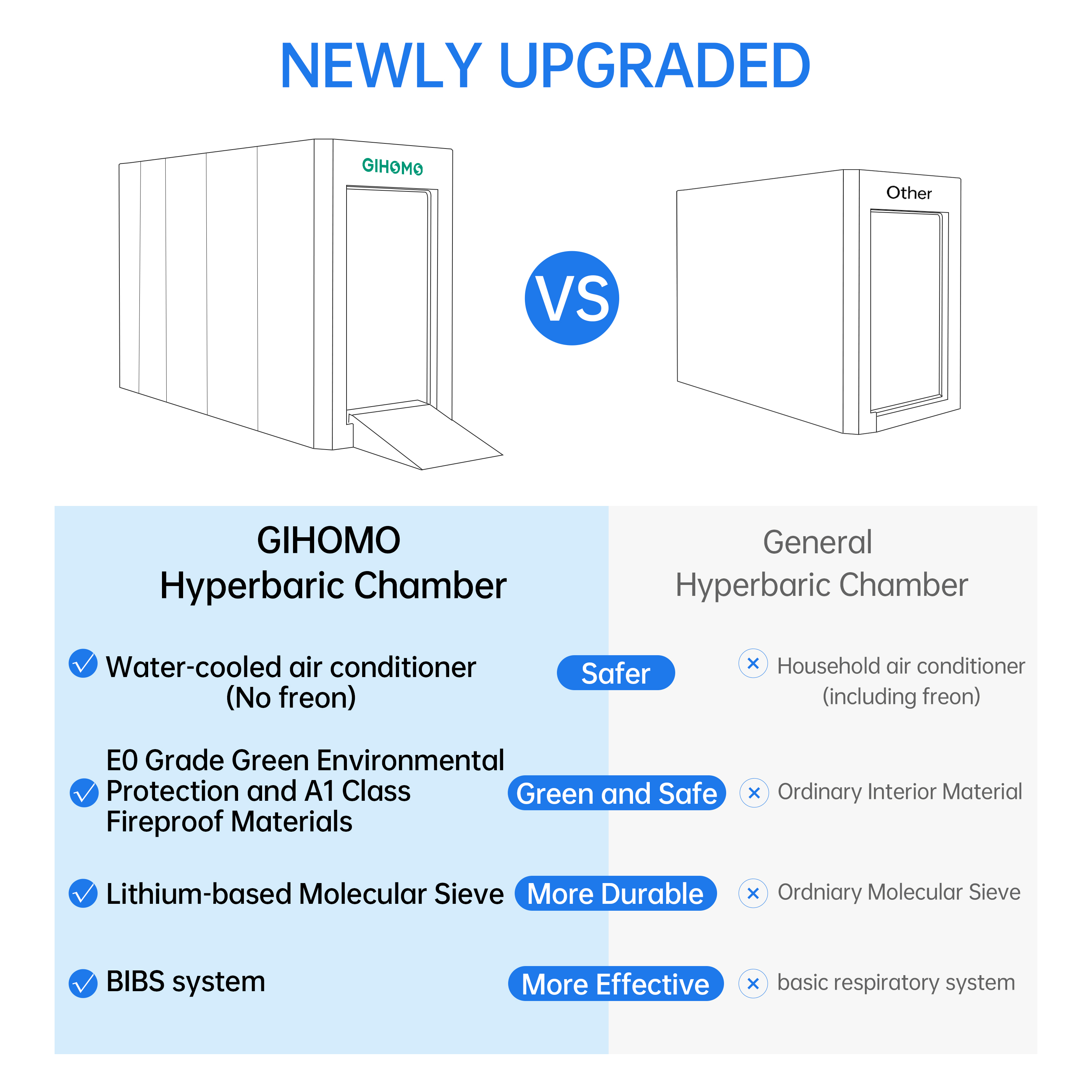 To eliminate fire risks, the chamber strictly prohibits the use of flammable and explosive items. It is equipped with a water-cooled air conditioning that avoids flammable refrigerants, and a 24V low-voltage DC power supply that reduces electrical hazards, creating a safe therapy environment.