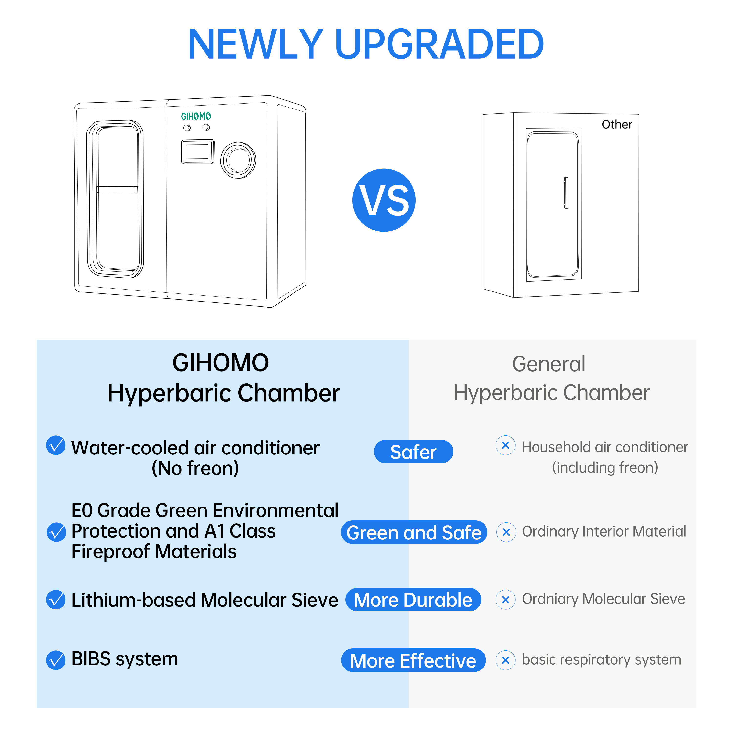 Safety is the top priority of GIHOMO hyperbaric equipment. It is equipped with a real-time gas concentration monitoring system, which continuously tracks the levels of oxygen and etc in the chamber and alarms immediately if there is any abnormality. The water-cooled air conditioning system avoids the risk of refrigerant leakage, and the thickened structure and pressure relief valve further ensure the safety of users during therapy.